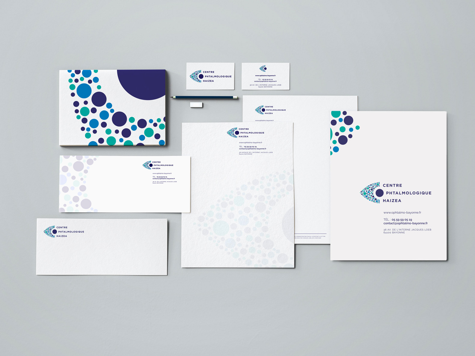 Le centre ophtalmologique HAIZEA de Bayonne a fait appel à Jal Studio pour travailler toute son identité visuelle et développer toute la papeterie indispensable à tous les médecins et l’équipe interne.